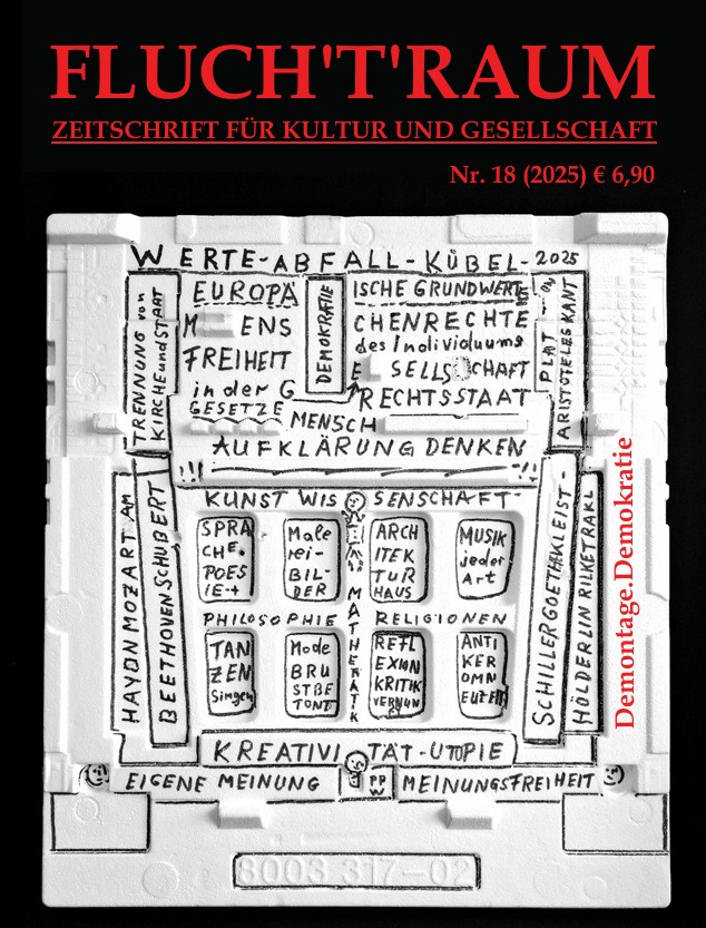 FLUCH’T’RAUM #18 bringt Texte von Peter P. Wiplinger, Stefanie Golisch, Claudia Dvoracek-Iby, Klaus Sinowatz, Steffen M. Diebold, Birgit Rabisch, Otto Dvoracek und Otto Reiter. Mit Fotos von Jürgen Sobkowiak, Annemarie Nowak und Paula Schneider.FLUCH’T’RAUM #18 erscheint Anfang Dezember 2025 zum Thema Demontage.Demokratie